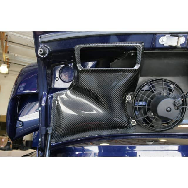This air intake uses the factory OEM back half of the intake box which includes the fault free OEM MAF tube. What we have done is beefed up the front cover with a full carbon fiber unit which is designed to intake more air volume which is then traversed over the flat panel air filter. The biggest improvement of this box is the dual snorkel. We have built a carbon fiber intake scoop which mounts on the bottom of the left side of the engine deck lid. This scoop takes the airflow from the vented deck lid and pushes it through the snorkel piece and down into the stock air box. The purpose of this design is to increase air flow to the factory filter.